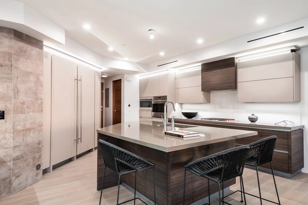 Modern kitchen with beige cabinets, dark wood accents, a central island with a sink, black chairs, and contemporary decor.